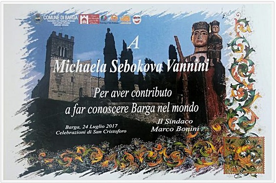 Il Comune ha così apprezzato la scelta di Michaela per aver collocato proprio a Barga la storia narrata nel suo libro di grammatica italiana, pubblicato in Slovacchia sotto il titolo “NOVÁ Taliančina pre samoukov“, Eastone Books, Bratislava, 2016.