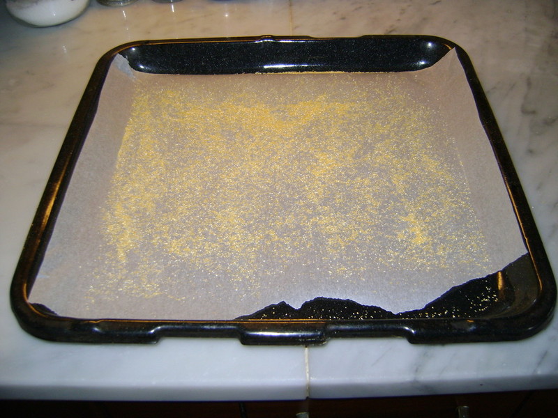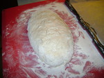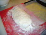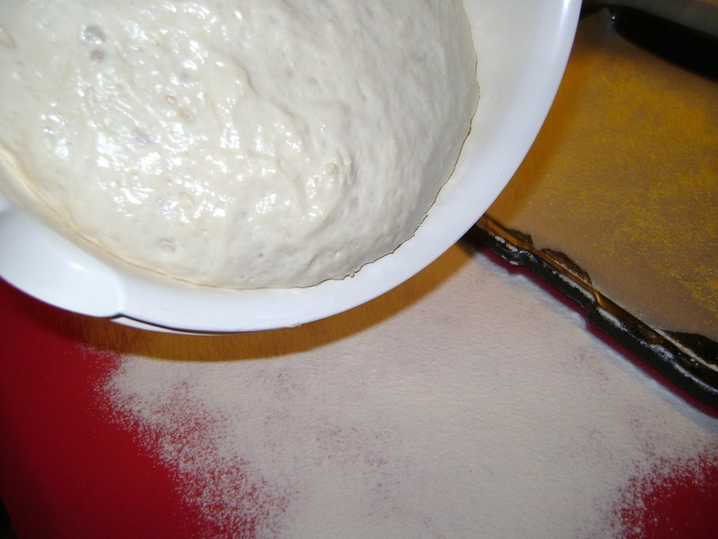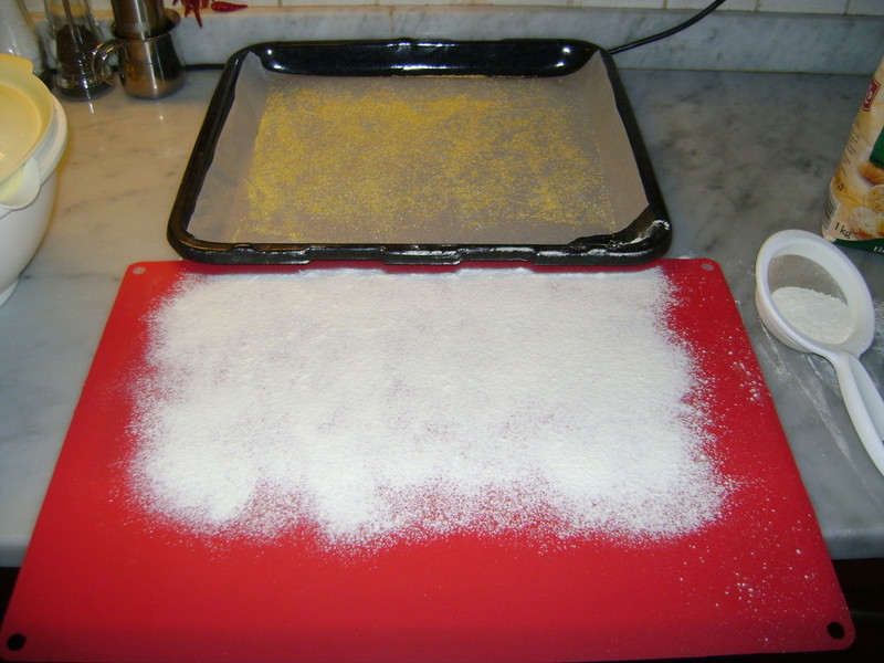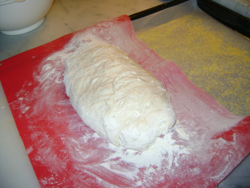 Preparate una leccarda e copritela con carta da forno, cospargetela con farina di mais (non molta). Sul piano di lavoro stendete un foglio di pellicola trasparente (oppure un foglio di silicone che si manneggia meglio), infarinatela con un po’ di farina, rovesciate la ciotola con l’impasto lievitato (aumentato quasi tre volte di volume) con la paletta da pasticceria, infarinatevi le mani e dategli la forma.