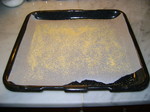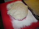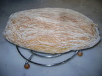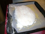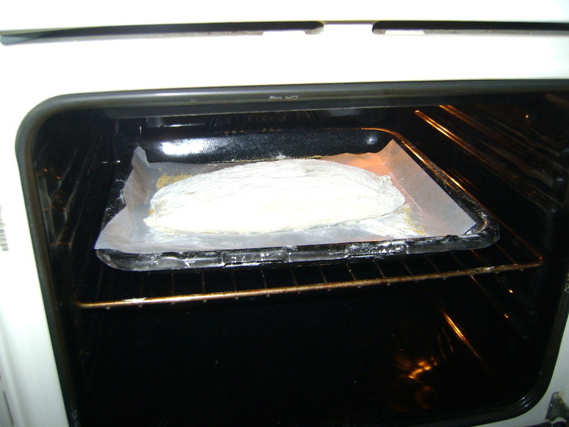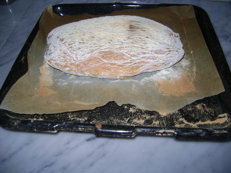 Sollevate con attenzione la pellicola con l’impasto, appoggiatela alla leccarda e rovesciate (capovolgendo) l'impasto in modo che vada nel mezzo della teglia (questa è la parte più difficile, non vi demoralizzate, con un po' di pratica vi riuscirà). Aggiustate la ciabatta con le mani infarinate, infornate nel forno preriscaldato a 190° C per circa 40 minuti.